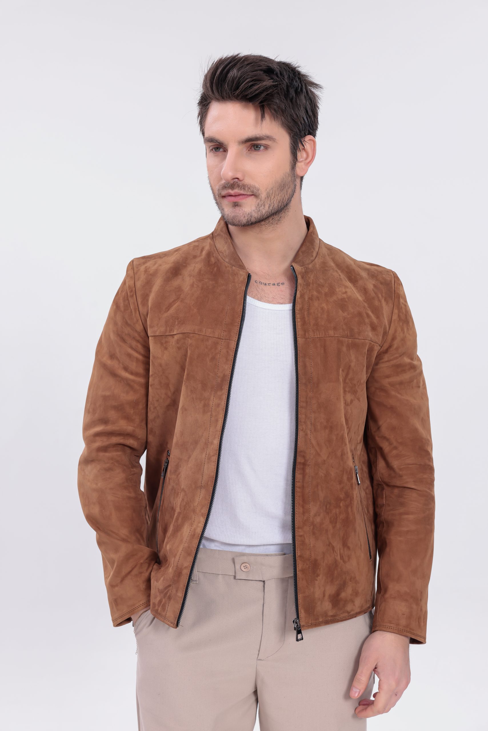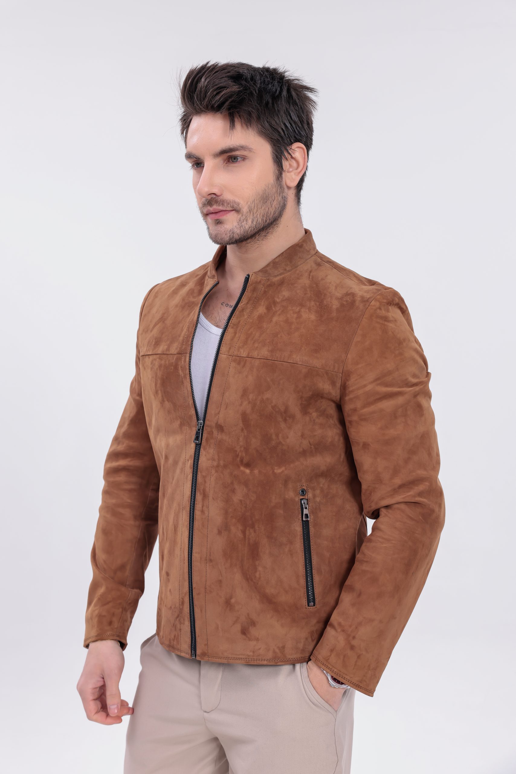 Această geacă din piele întoarsă camel pentru bărbați poate fi purtată cu ușurință atât în ținute casual, cât și în outfituri urbane elegante, oferind mereu un look modern și sofisticat.