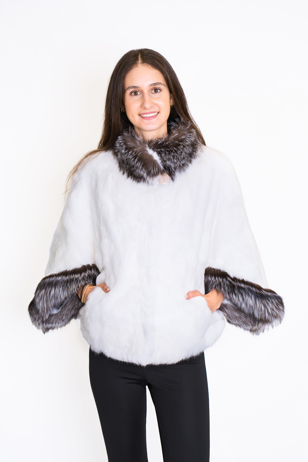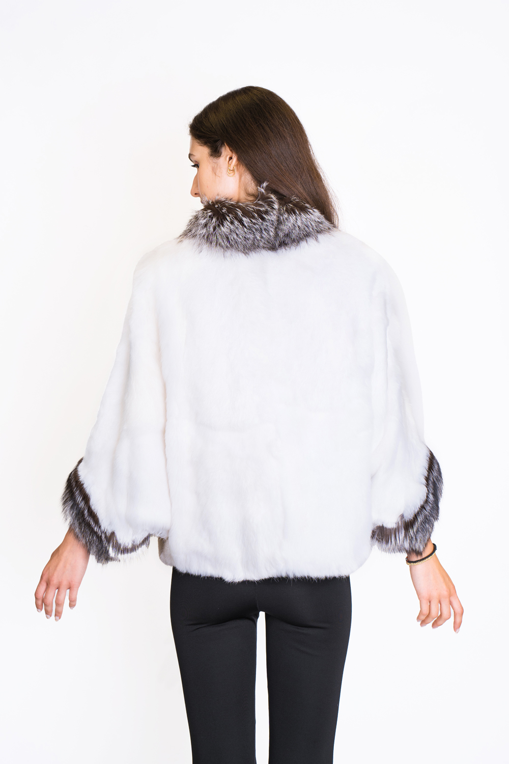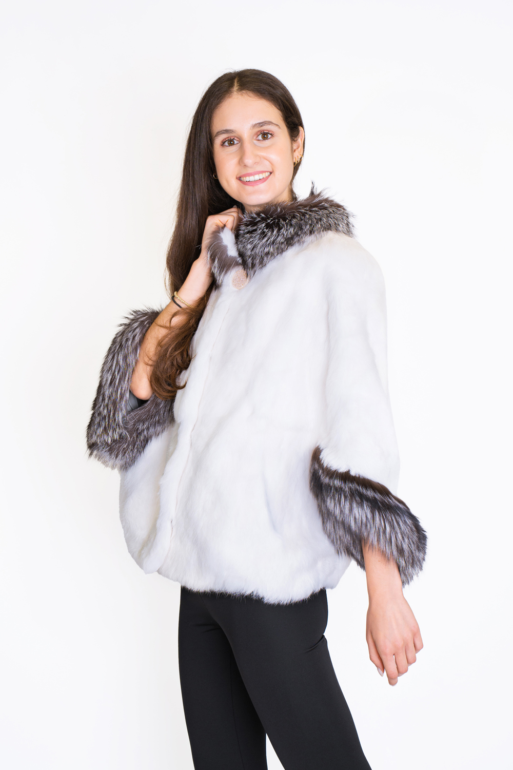 Haina din blană naturală chinchilla și vulpe este o piesă premium ce combină delicatețea chinchillei cu accentele elegante de vulpe într-un design luminos și sofisticat.