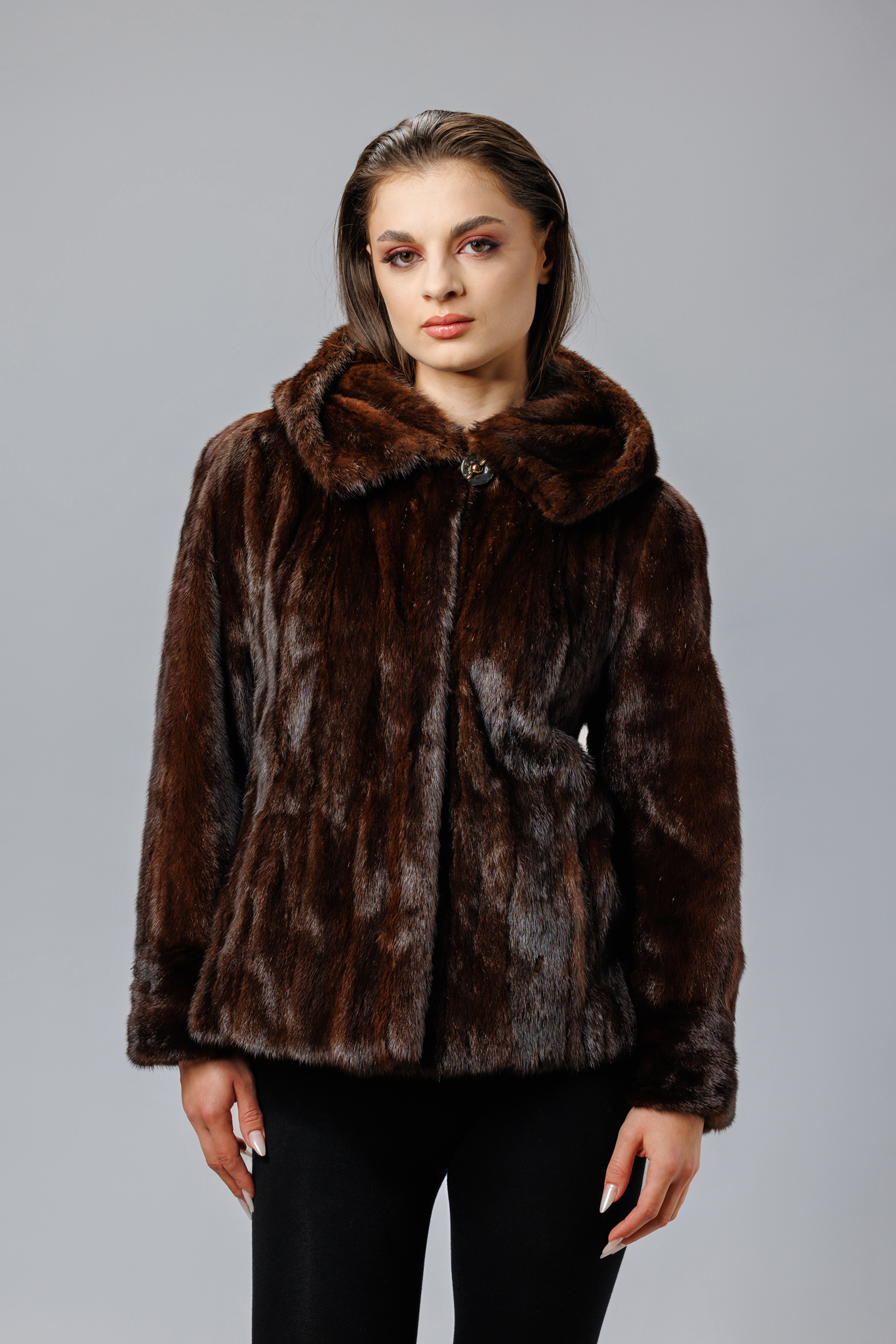 Haină din blană naturală de nurca, cu glugă, culoare maro brun