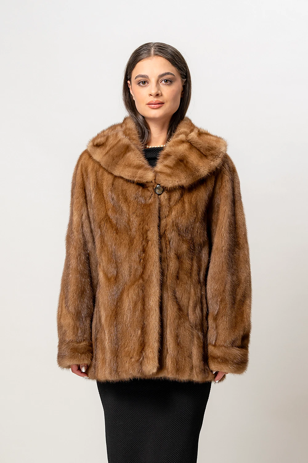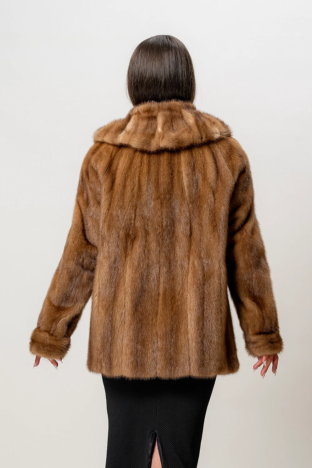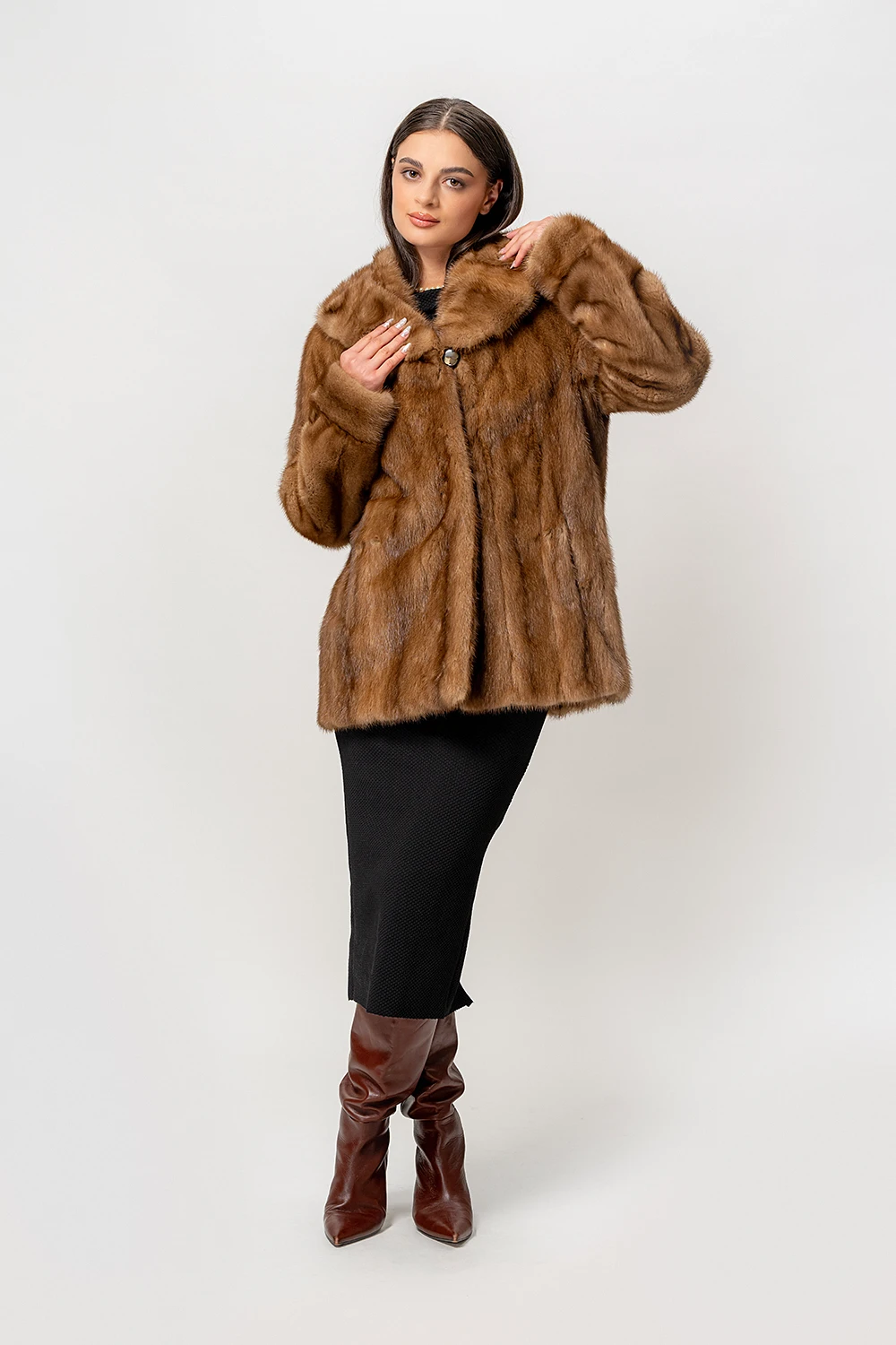 Haina din blană naturală de nurcă, maro deschis este un model elegant, călduros și ușor de purtat, cu guler rafinat și finisaje premium, perfectă pentru sezonul rece.