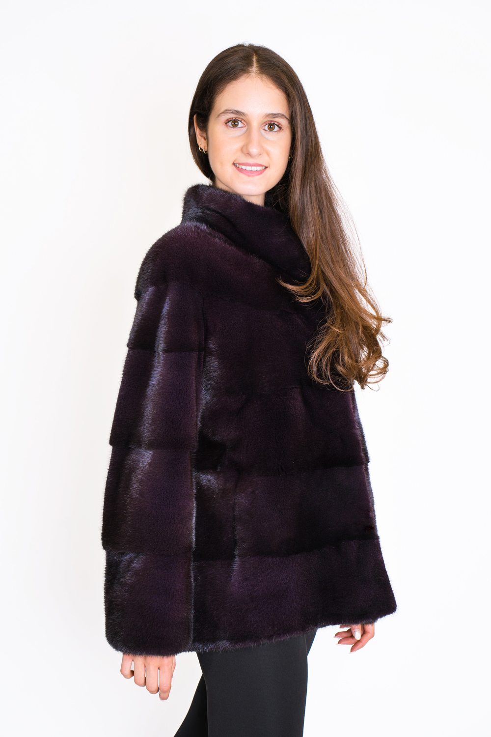 Haina din blană naturală de vizon este o piesă premium în nuanță mov închis, cu croială tip tunică și detalii elegante ce oferă rafinament și confort în sezonul rece.