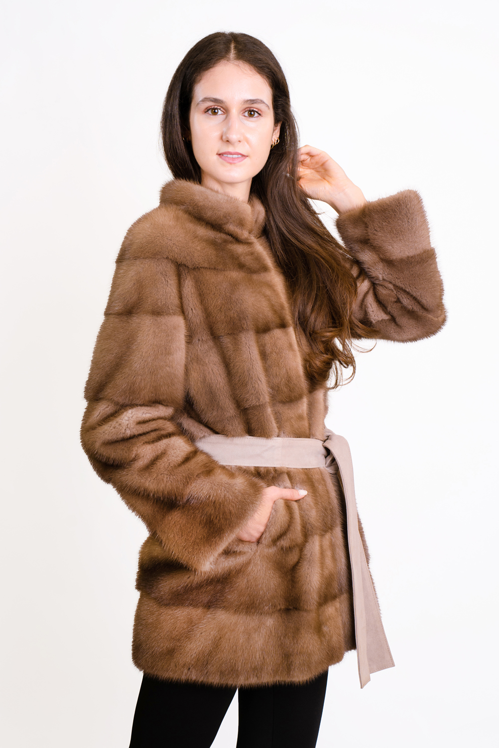 Haina din blană naturală de vizon reprezintă alegerea ideală atunci când îți dorești o piesă premium, realizată cu atenție la detalii și finisaje impecabile. Nuanța de maro deschis pune în valoare textura luxoasă a blănii, iar croiala clasică oferă un aspect elegant și echilibrat. Lungimea de aproximativ 75 cm creează proporții armonioase și o siluetă rafinată, în timp ce cordonul din talie conturează discret forma corpului. Această haină este concepută pentru a-ți oferi confort și stil în același timp, fiind potrivită atât pentru ocazii speciale, cât și pentru apariții de zi cu zi.