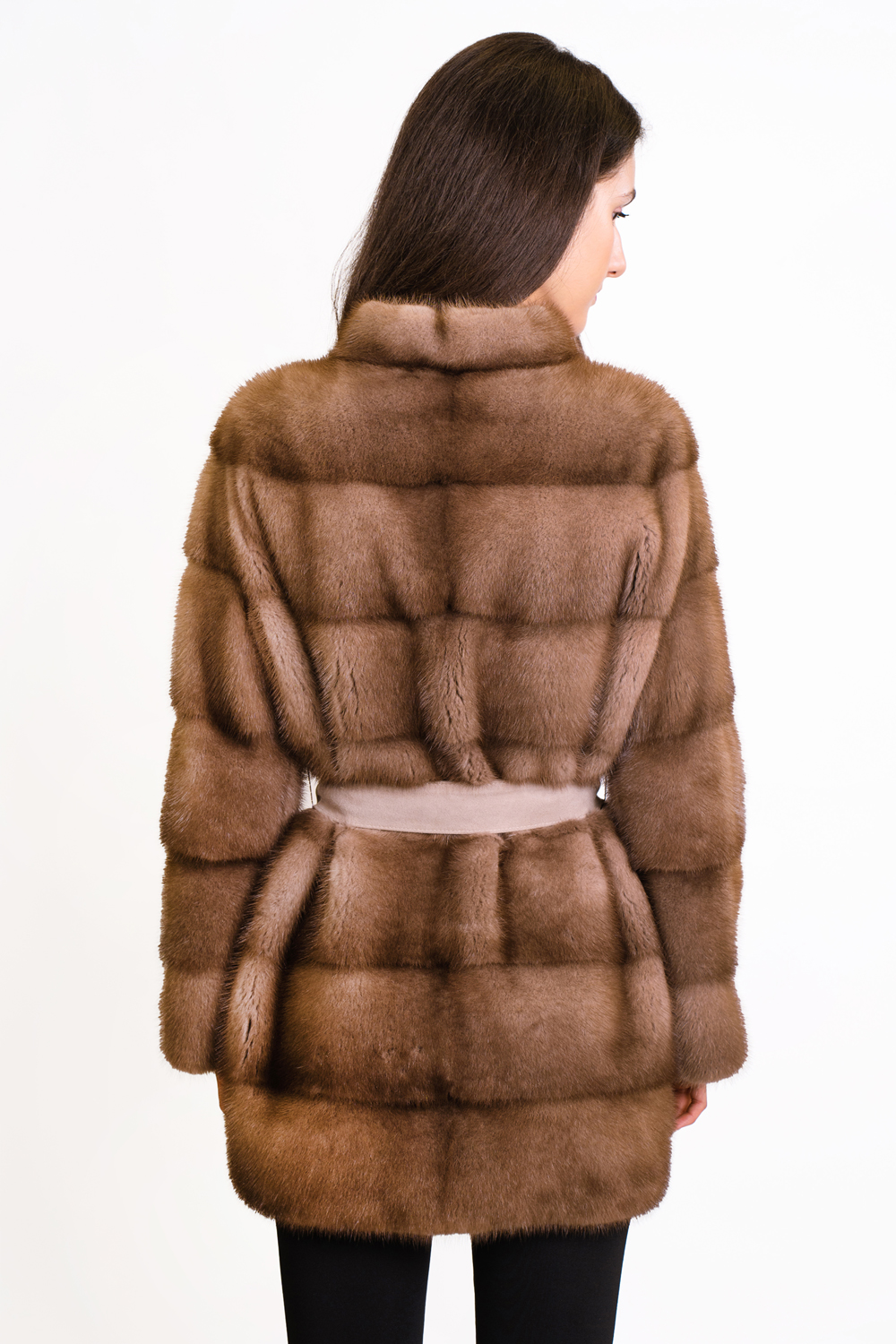 Haina din blană naturală de vizon este o piesă premium în nuanță de maro deschis, cu croială clasică și talie evidențiată, oferind eleganță și confort în sezonul rece.