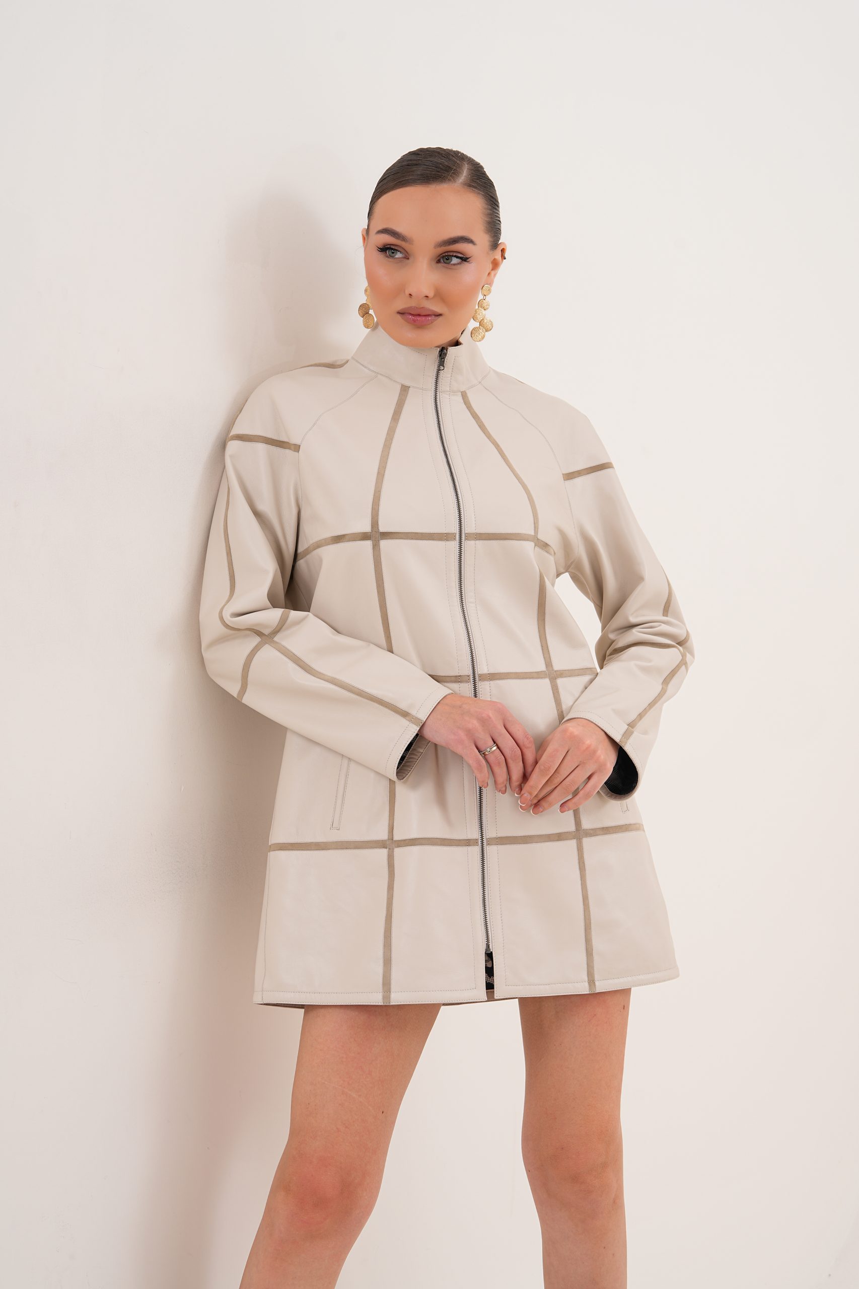Descoperă eleganța modernă reinterpretată prin această haină din piele naturală de calitate superioară, două fețe, creată pentru femeia puternică, sigură pe stilul ei. Modelul impresionează prin croiala lejeră, lungime medie și detalii minimaliste, fiind ideal atât pentru ținute casual urbane, cât și pentru apariții sofisticate.