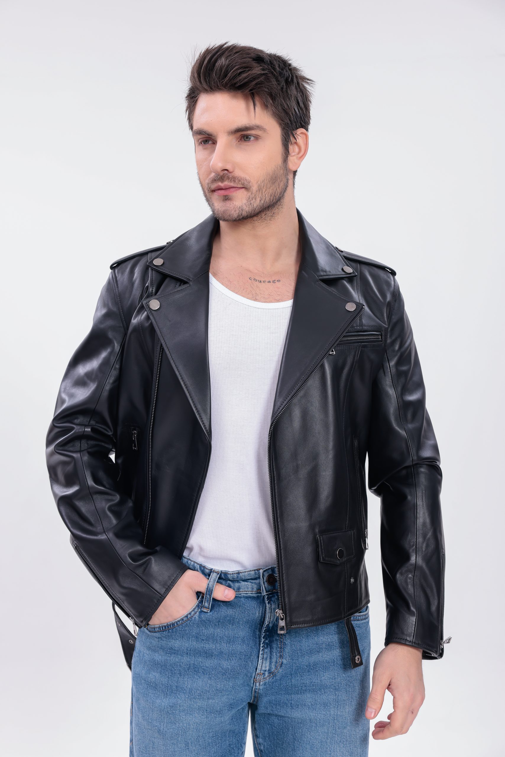 Versatilă și mereu la modă, această geacă biker din piele naturală neagră este o piesă esențială pentru orice garderobă masculină.