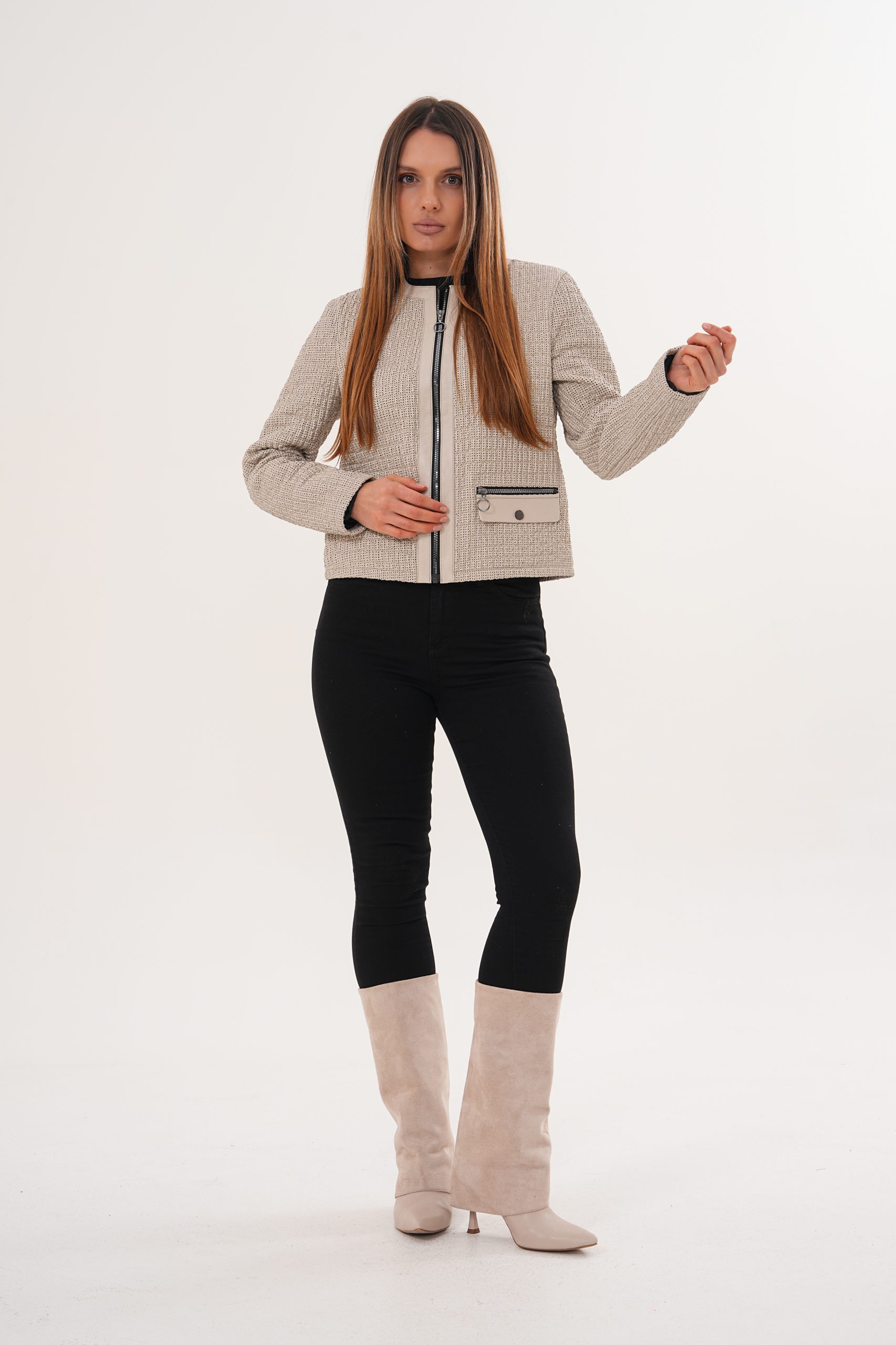 Croiul feminin, ușor cambrat, evidențiază silueta într-un mod armonios, iar închiderea frontală cu fermoar și detaliile contrastante completează designul modern. Buzunarele frontale decorative adaugă un plus de stil și echilibru vizual.