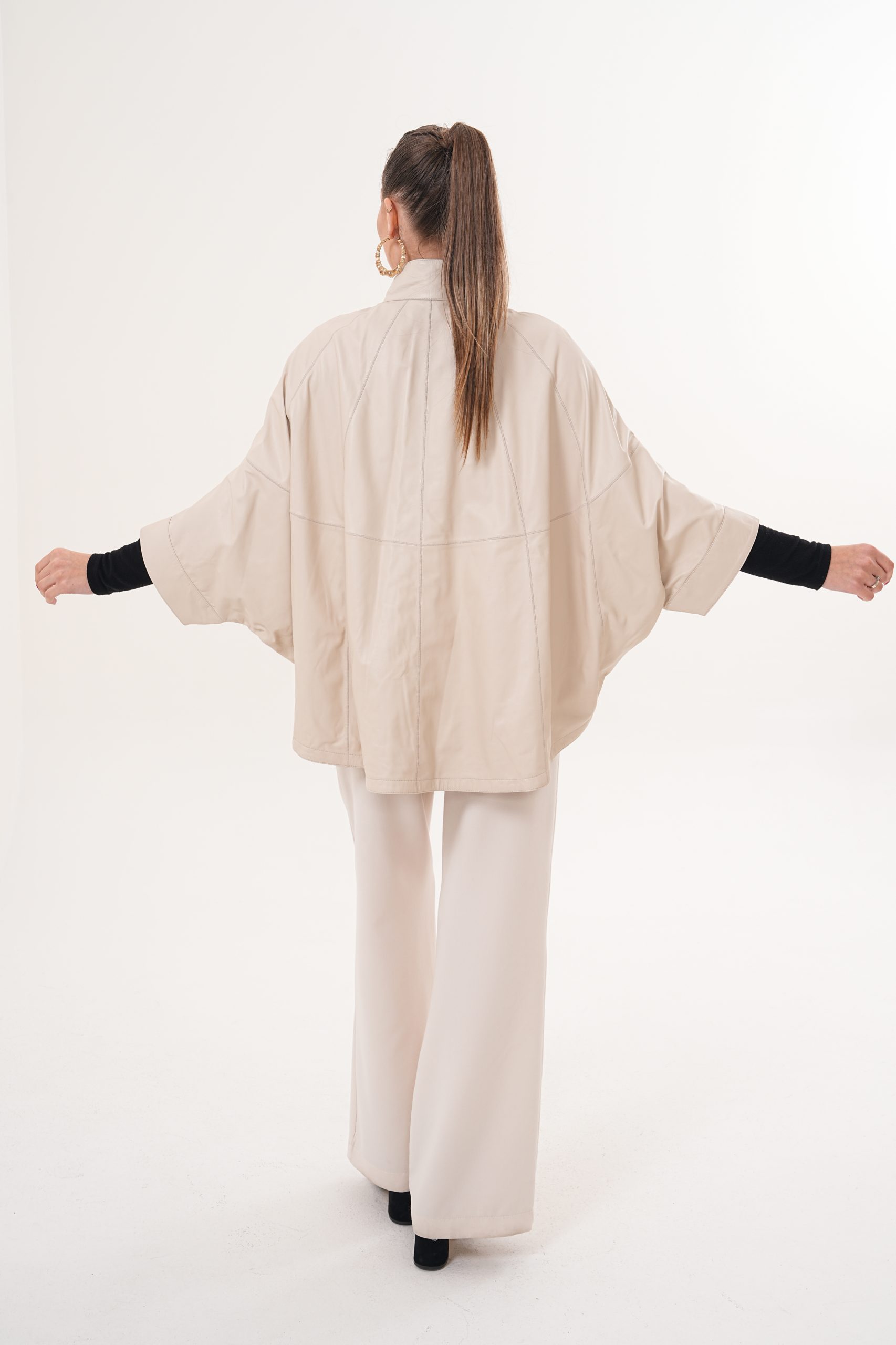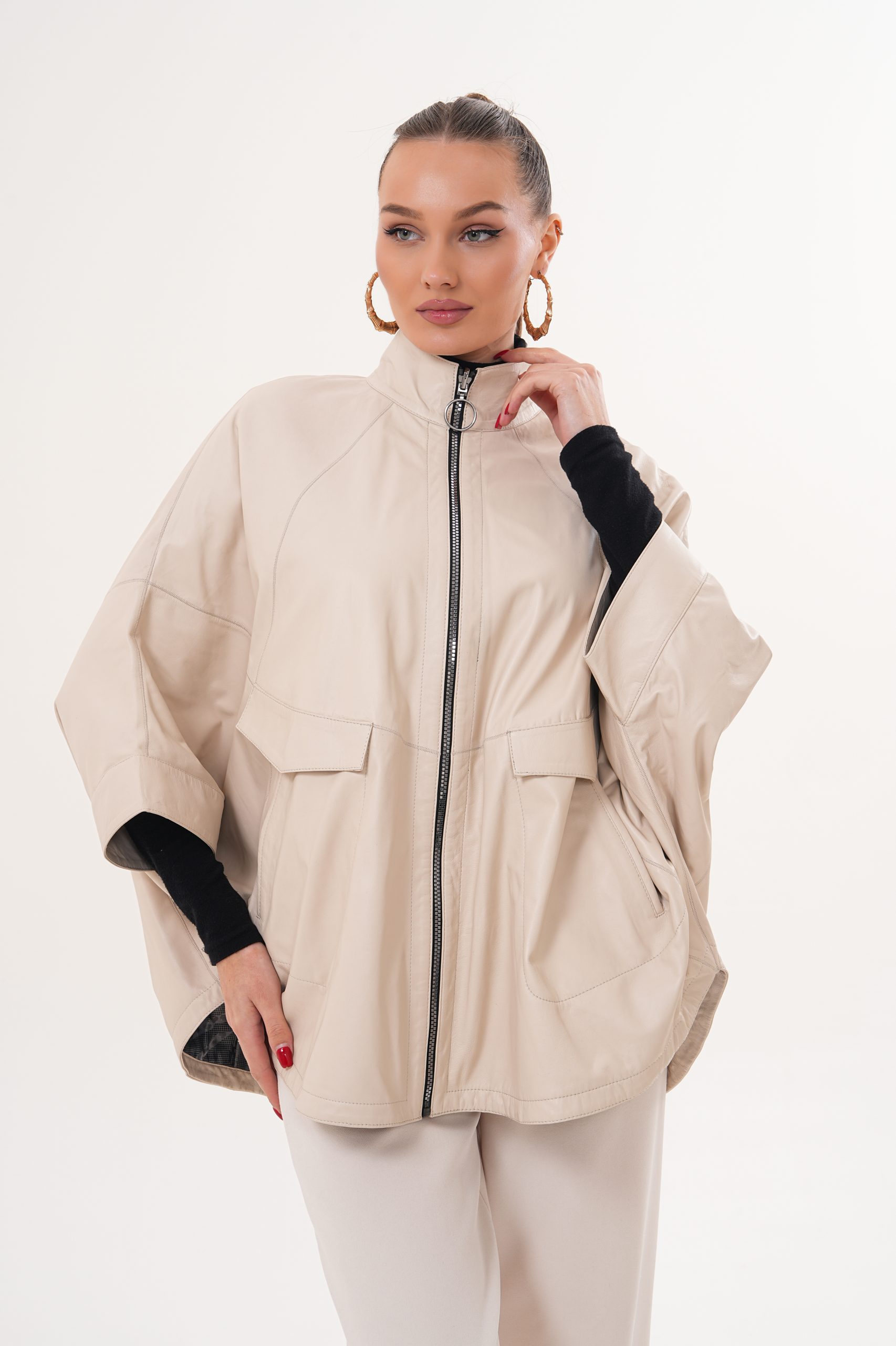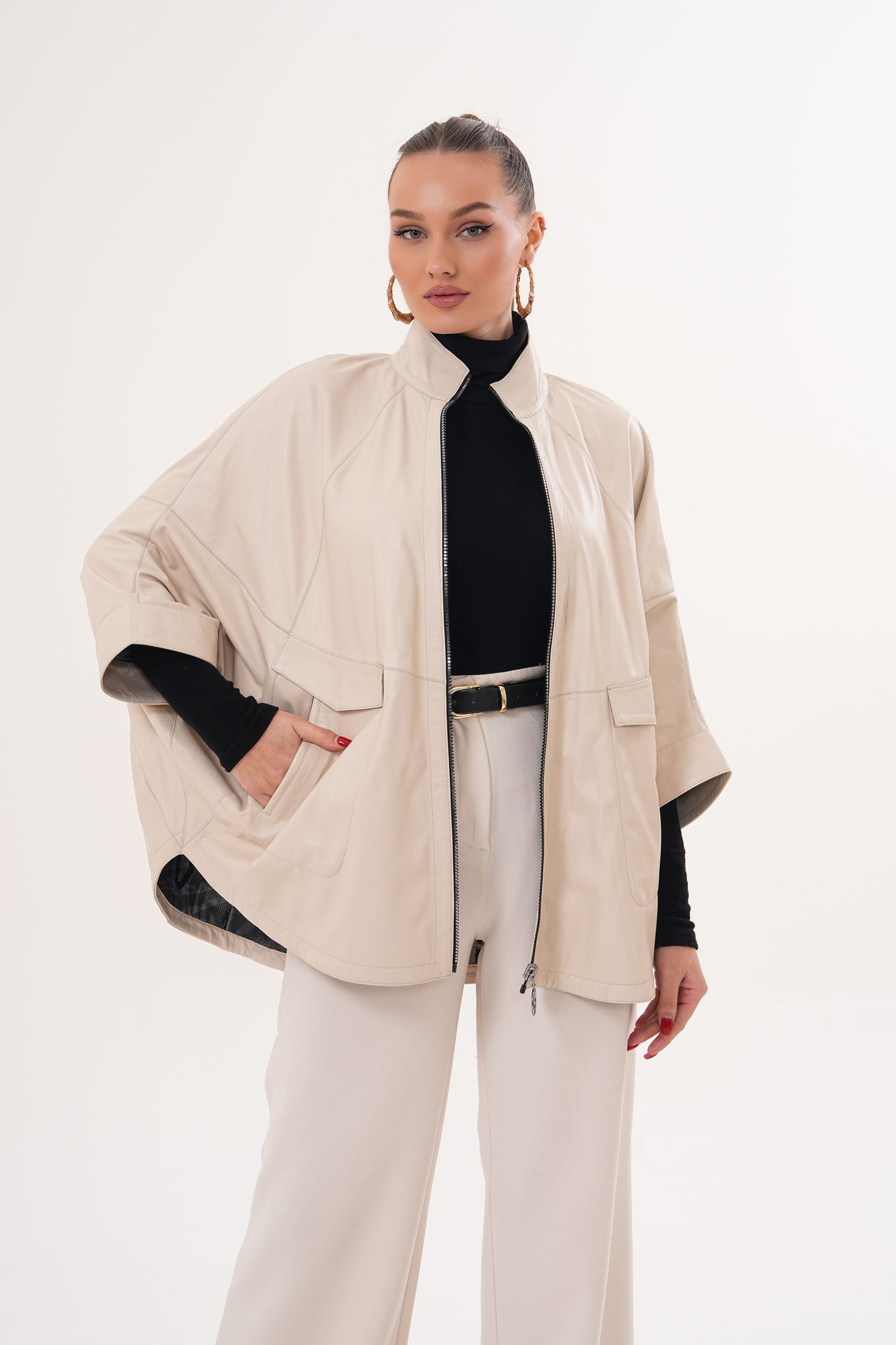 Poncho damă oversize din piele naturală, culoare crem, reversibil