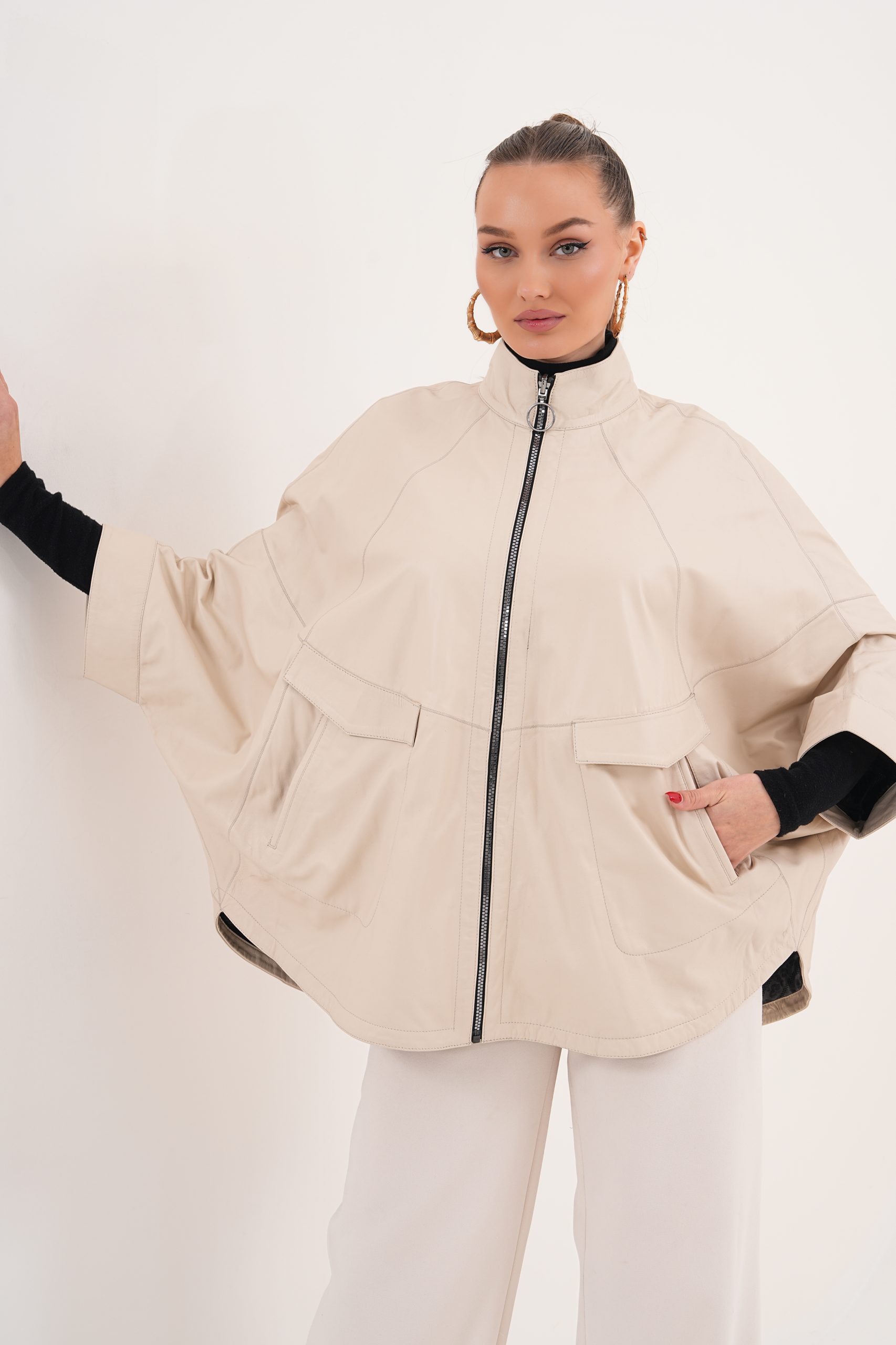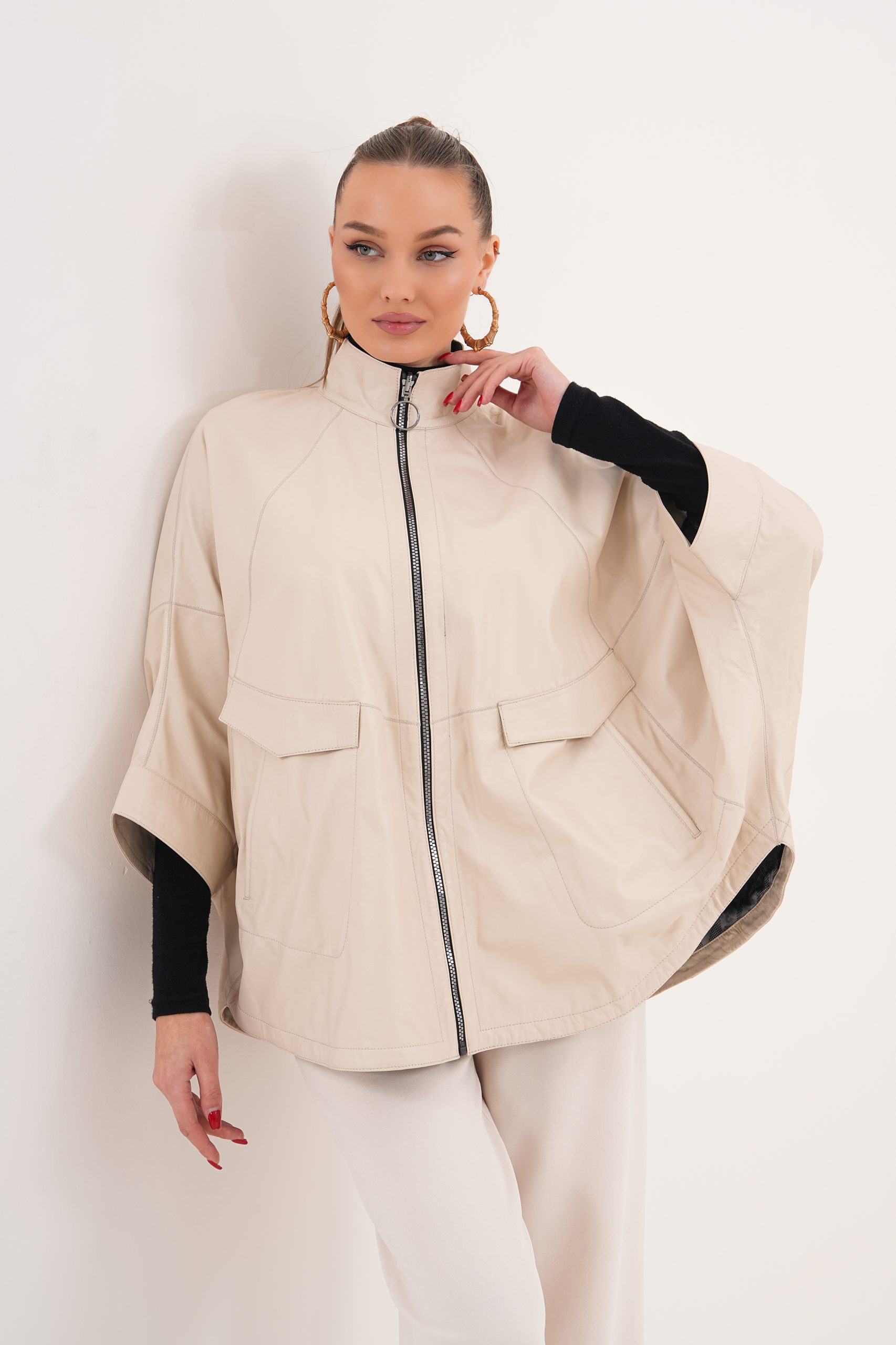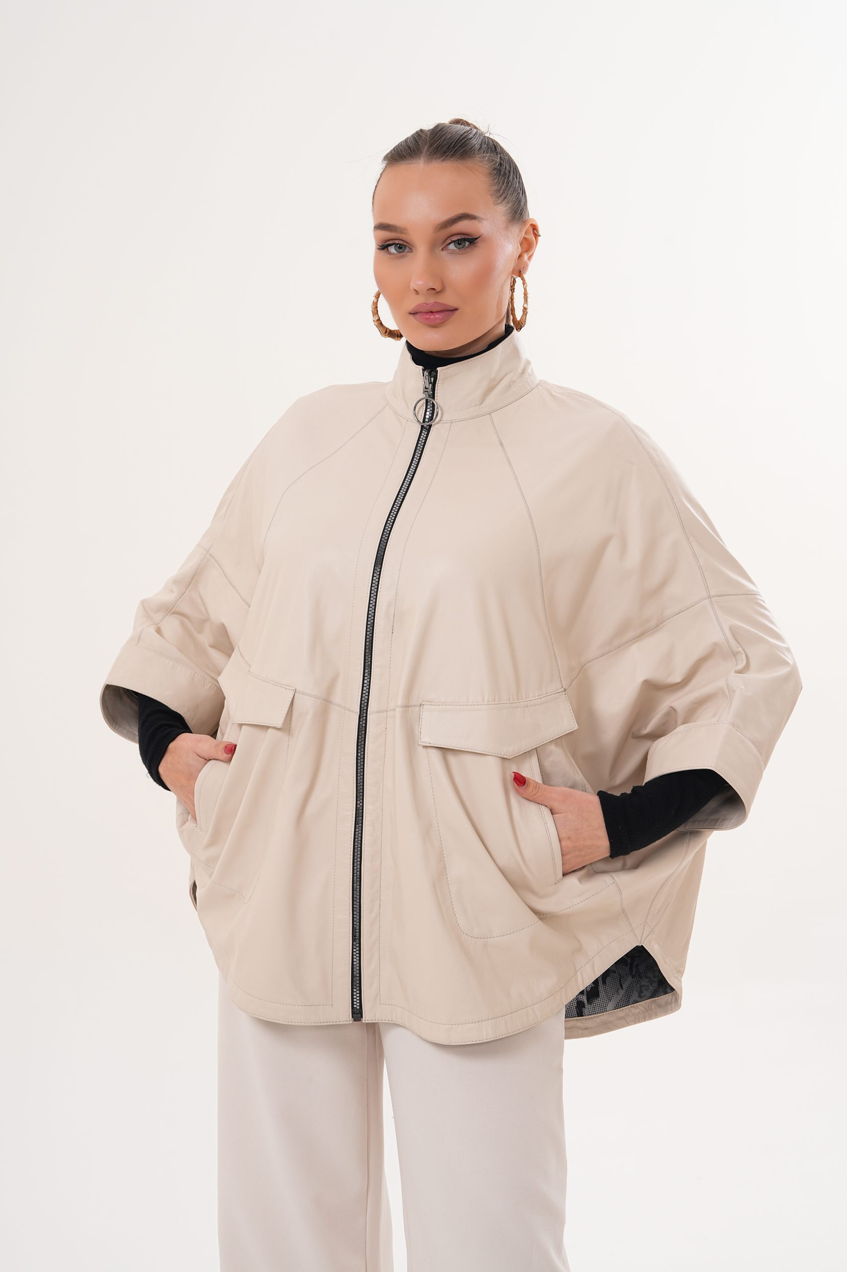 Poncho damă oversize din piele naturală, culoare crem, reversibil