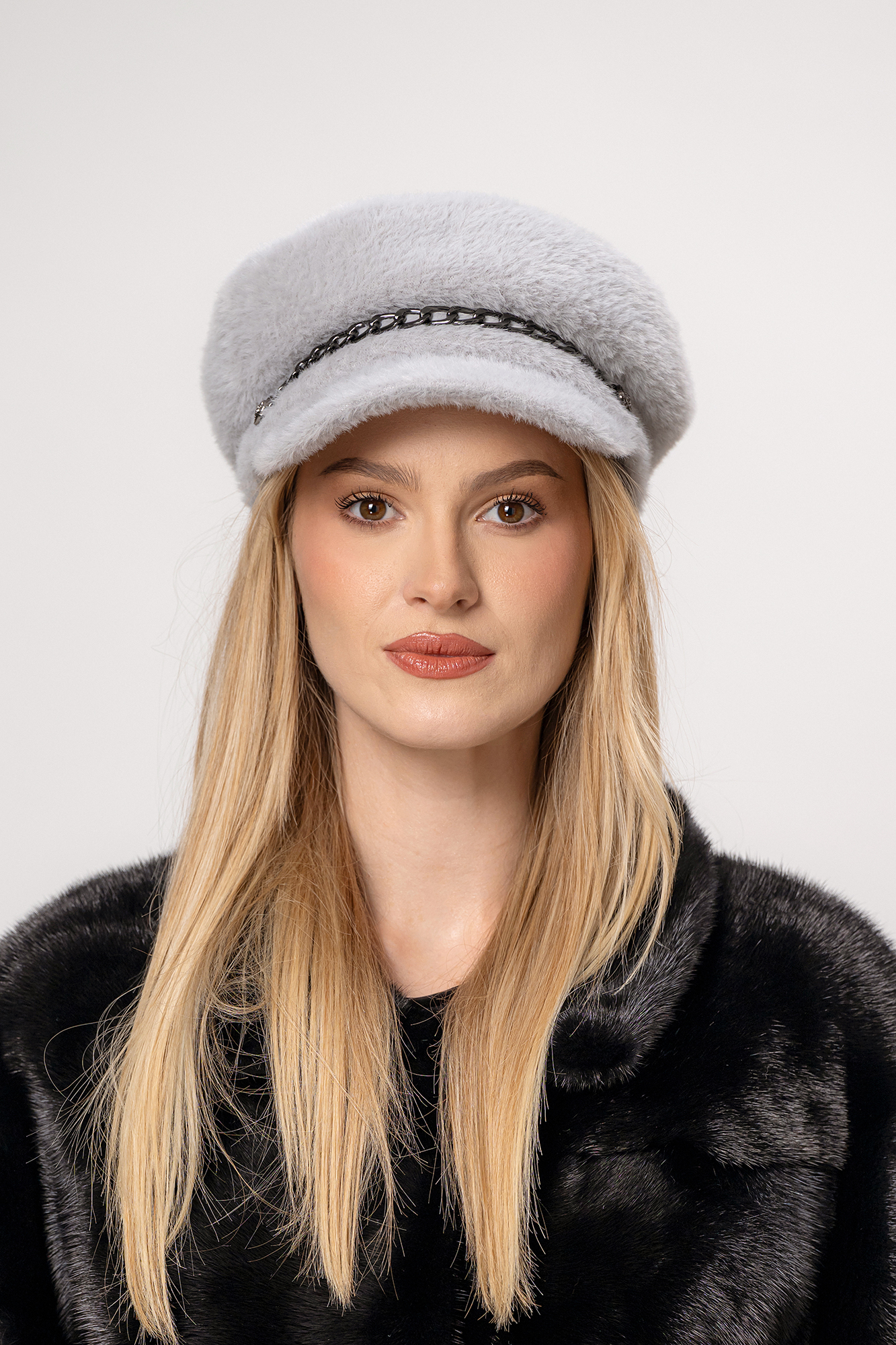 Tonul neutru permite ca șapca damă din textil cu interior polar, culoare gri, mărime universală să fie integrată cu ușurință în ținute alcătuite din paltoane, haine de blană sau jachete contemporane. Lanțul decorativ frontal adaugă o notă modernă și discretă, accentuând stilul versatil al acestui model. Forma structurată și linia lejer orientată spre zona frontală avantajează trăsăturile feței și creează o prezență vizuală elegantă, ideală pentru persoanele care apreciază simplitatea sofisticată.